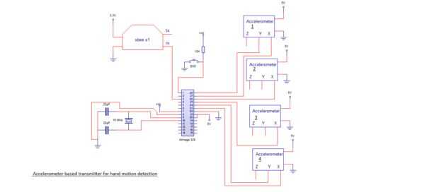 Acelerómetros se utilizan para proporcionar información de la posición exacta de la mano del usuario. Hemos utilizado 4 acelerómetros para adquirir información de la posición del cuerpo del cuerpo humano. Da valores en z, x, y, sistema de 3 ejes coordinados. Como se puede ver en el diagrama del circuito, nos han tomado x y y información del acelerómetro presente en muñeca y la cabeza del usuario. Y para otros dos acelerómetros presentan en codo y el hombro sólo estamos tomando x la información.