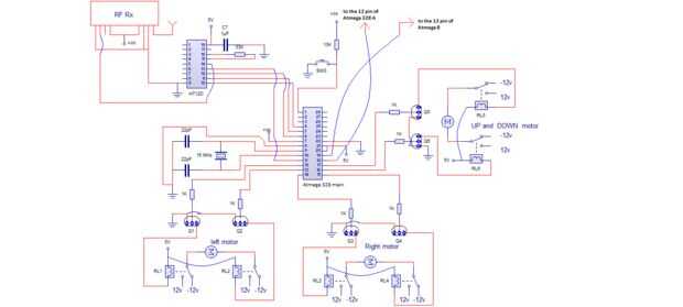 Módulo de receptor RF XBee es responsable de recibir las señales inalámbricas, mientras que la señal se aplica a los datos del decodificador HT12D a través del pin de datos del XBee. HT12D decodificador convierte esto en datos en paralelo para obtener la señal original enviada. Para el procesamiento posterior, este datos en paralelo se dan al microcontrolador ATmega328. Genera un código de 4 bits para controlar servo motores para realizar izquierda, derecha, adelante o hacia atrás del movimiento.