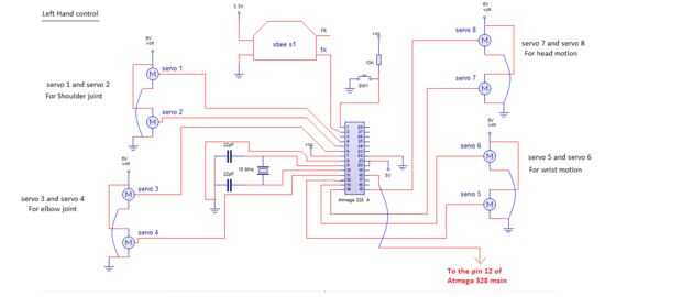 En el receptor, las señales recibidas se aplican al microcontrolador ATMega328 otra vez. Ya que el servo entiende valores entre 0-180 grados tenemos realizan mapeo nuevo para convertir esos valores en la banda de 0 a 180. Esta asignación se realiza mediante programación. Los valores asignados se aplican a los servos que son responsables de realizar movimientos del cuerpo humanoide.