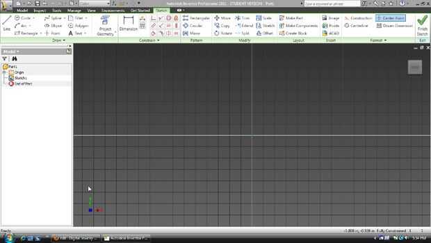 Inicialmente se abrirá una plantilla con el nombre predeterminado Part1 (el número aumentará como se crean archivos de parte posterior). A la izquierda de la ventana del programa un navegador se habrá convertido en visible. Este navegador, como se dijo anteriormente, organiza las características de modelado y herramientas que habrán sido utilizar para hacer la parte. Como se trabaja la lista será más larga y mostrar directorios de las relaciones celebradas entre ciertas características (como entre protuberancias y un bosquejo que cubriremos más adelante). Actualmente, la lista incluye el nombre de la pieza, una carpeta de origen (contiene la x original, y, eje z y sus planos correspondientes) y también Skecth1.