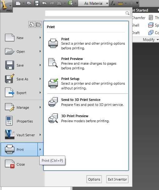 2. Abra el menú de la aplicación de Inventor y haga clic en la flecha junto a [imprimir]