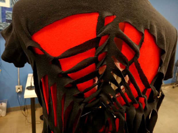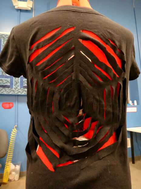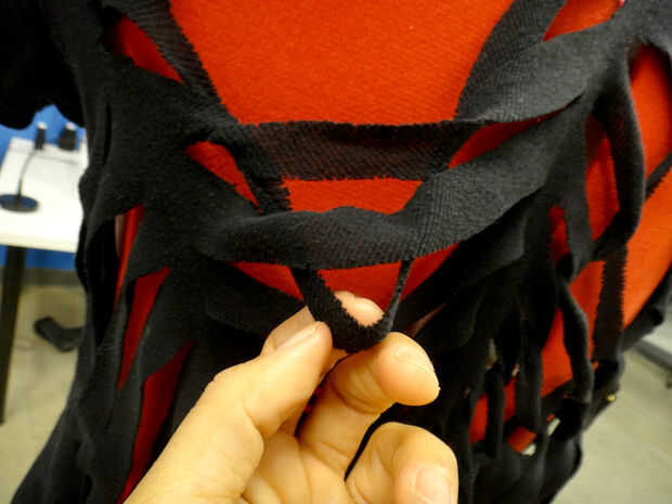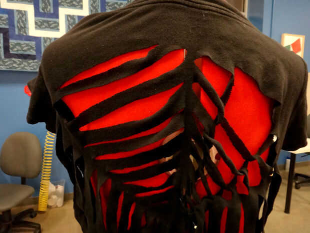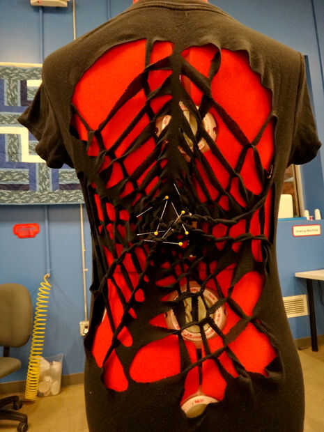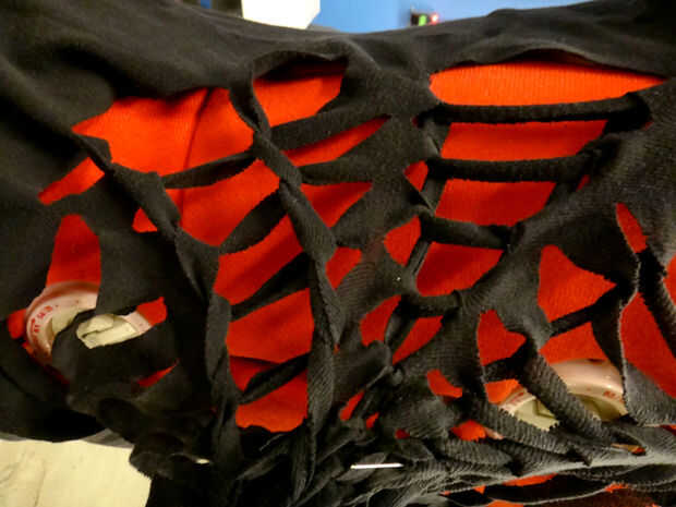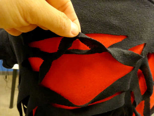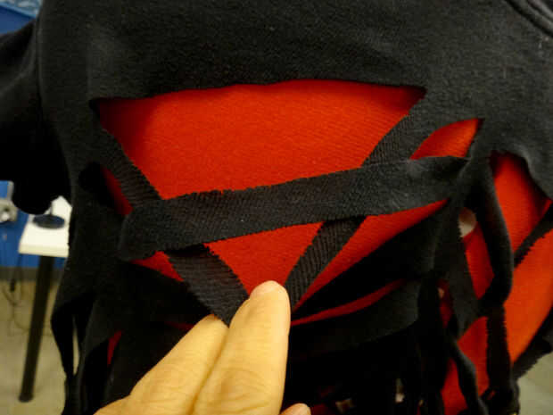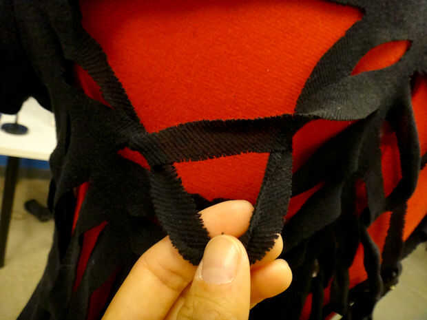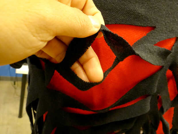 Al llegar al final (en medio de la web), utilice un alfiler para sujetar la punta de la tela para la camisa. O se puede atar o coser cerrado como vas. Para atar en un nudo, cortar un pequeño agujero, cortar la última tira en el centro y colócala en el orificio. Ate los extremos en un nudo doble. También puede coser para fijarlo. Utilice el hilo negro.