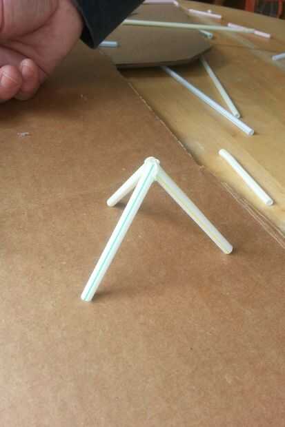 Hacer un trípode con la paja de 6 cm como en la imagen 1. Pegamento en la parte inferior de la pirámide de la vivienda y debe tener algo como en la última imagen.