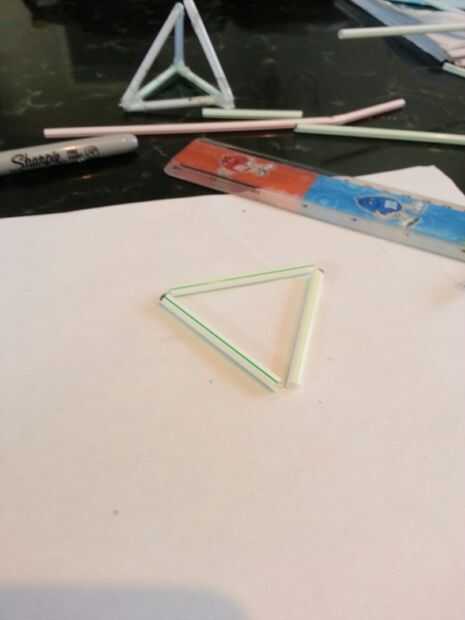 Ahora que han cortado 6 pajas, 3 de ellos y hacer un triangulo cerrado como el de las fotos de arriba. Una vez lo has hecho, toma su pistola de pegamento que has previamente calor y pegue la esquina juntos un triángulo a la vez. Al pegar el triángulo ser cuidado de no mover la forma parte. Si mueves el movimiento triángulo mientras el pegamento es todavía suave.