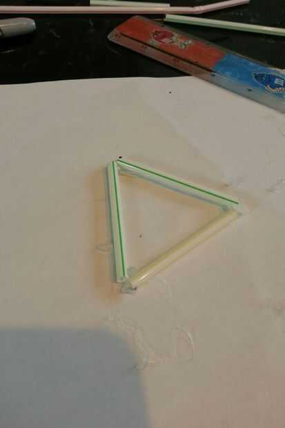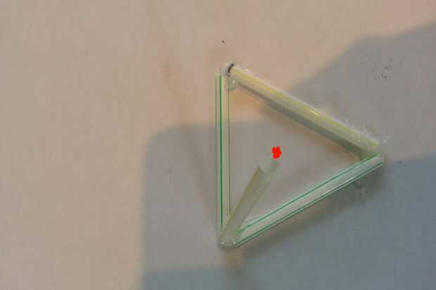 Después de que hayas terminado de pegar la base debe tener algo que se ve así. Para empezar la parte alta de la pirámide, tomar el resto de la paja de antes y pegamento a uno por uno a cada esquina, como el en la figura 2. Mirar hacia abajo desde la parte superior de la pirámide para ver si la paja en el medio (Figura 3). El punto rojo marca el centro. Repetir este proceso para el resto de las esquinas.