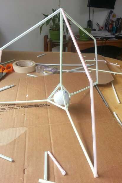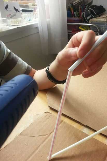 Pegar una paja hasta el final de la viga como en la imagen 1. Luego unir con otra paja y repita para la mitad superior hasta que terminas con algo como esto.