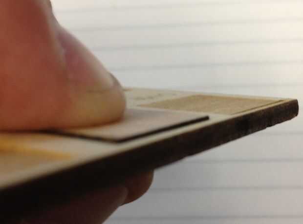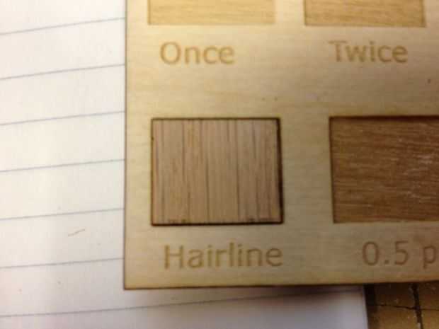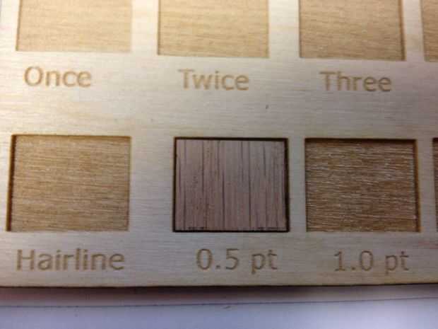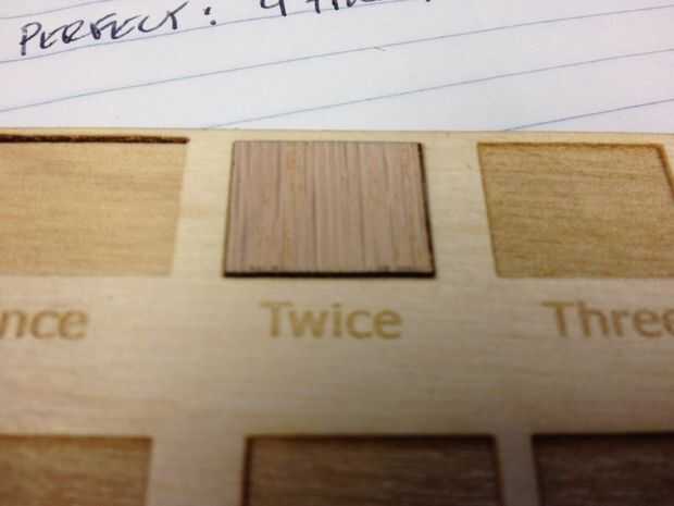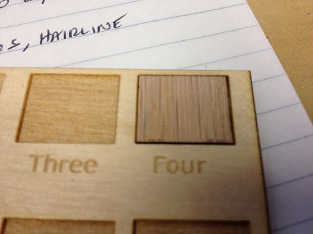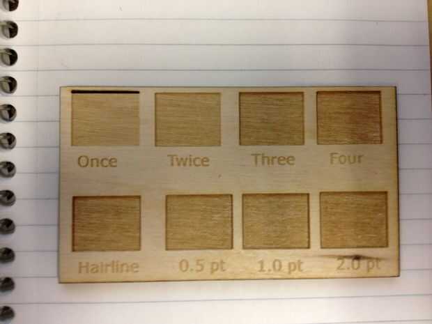 Hice una pequeña prueba de dibujo en CorelDraw. La primera línea es cuatro cuadrados negros, todo el mismo tamaño. Configurar el cortador del laser de TechShopde 45 vatios Epilog Helix a exploración de trama en 600 dpi, velocidad 60%, 90% de energía, y lo para el modo 3d. Me trama grabado los cuatro una vez. Luego selecciona la mano derecha tres y grabado al agua fuerte otra vez. A continuación, sólo los dos últimos hacerlo otra vez. Y finalmente sólo el cuadro de mano derecha para una trama pasado.