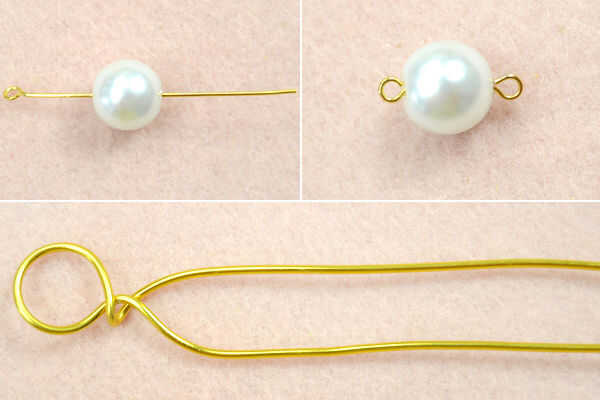 1 º, un eyepin a un grano de la perla del hilo de rosca, hacer un lazo para hacer un grano de la perla de enlace, lo mismo para hacer 15 enlaces de grano de la perla totalmente; cortar un alambre de aluminio de 30cm, doblar por la mitad, envolver un bucle como el siguiente cuadro muestra;