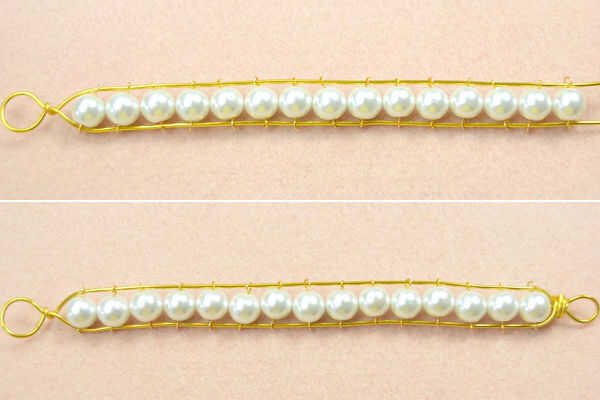 hilo de rosca 2, que los links 15 grano de la perla para el aluminio de los cables en ordenar, envolver un lazo con un hilo, luego envolver algunos círculos alrededor del bucle para sujetar la pulsera, cortar los cables extras;