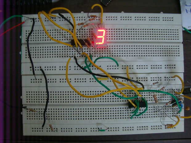 Si utiliza IC 7493, hay sólo pocas conexiones necesarias. Reloj externo de entrada de un temporizador 555 etc. a la entrada (Terminal 14). QA (terminal 12) conectado a la entrada B (terminal 1). QD, Qc, Qb, Qa de IC 7493 figuran como entradas DCBA del IC 7447 y el resto de las conexiones de la pantalla son los mismos con las resistencias de limitación actuales. Reajuste las conexiones (que varían entre 0-5 contador y contador de 0 -9) han de realizarse.