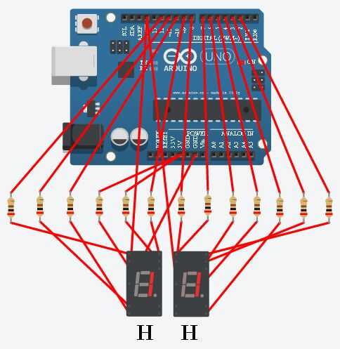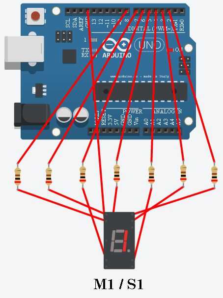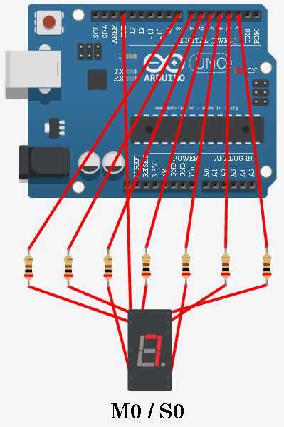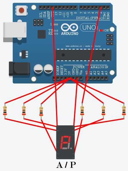 Otra vez no olvides el resistor limitador actual de 330 ohmios. También tienes que conectar el terminal común en la pantalla al terminal GND de la Junta (indicando que este display es de cátodo común).