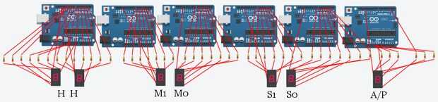 Nota: La siguiente simulación no es "Reloj Digital con Arduino". Las simulaciones son para cada contador expresado en el diagrama. Esto es sólo para la visualización de las salidas y por lo tanto no reciben instrucciones del hardware de Arduino. El programa sin embargo puede ser visto a través de la simulación para la comprensión de nuestros contadores.