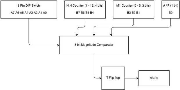 El módulo de alarma utiliza un comparador de 8 bits para aceptar el tiempo de uso definido. Como se explicó antes, los primeros 4 bits se dedican a HH, el siguiente 3 bits son M1 y la última parte es aceptar un/p. Estos datos de 8 bits se denota A. La entrada del interruptor dip se da para el comparador. Los correspondientes bits de datos se aplican también de los flip-flops. El loic es que whn al tiempo que contó b que te flip-lops es igual a la del interruptor, A = B del comparador se convertirá en 1. Se utiliza para activar otro labio-flop (su dedicado a esta función solo) que está conectado a la alarma. Así que, cuando A = B, la alarma suena y sigue sonando hasta que el flip-flop se restablezca manualmente a 0.