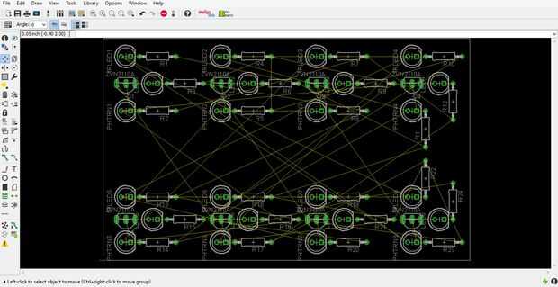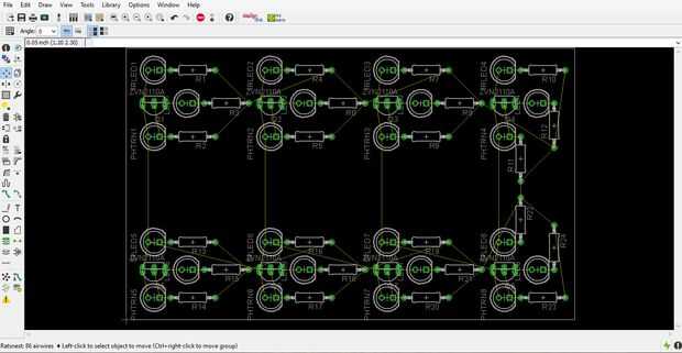 Es importante asegurarse de tener los paquetes LED orientados correctamente, por ejemplo, el ánodo a la izquierda y el cátodo a la derecha (mirar mis imágenes para referencia). Nota: tuve que rotar las resistencias en el borde derecho del tablero para que encajen. Otra nota: en la versión de software libre del águila, esta es la tabla más grande se puede hacer. Si usted tiene una licencia remunerada, puede ajustar el cuadro blanco y hacer una tabla más grande. Por suerte, este tamaño de esta placa es perfecta para el proyecto que estamos trabajando.