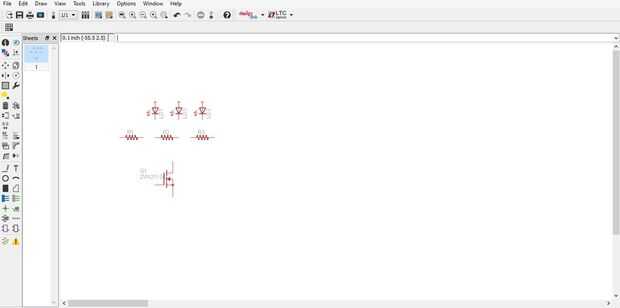Para el transistor, hay sólo un paquete disponible en esta biblioteca, "ZVN2110A". Selecciónelo y haga clic en Aceptar. Coloque una cerca de tu LED y resistencias asegurándose de que ninguno de los componentes se toquen. Presione "Esc" y cierre fuera de la ventana de biblioteca cuando reabre.