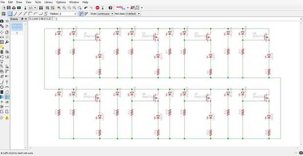 Después los componentes donde yo quería, que conectado a cada uno mediante la herramienta "Net". Nota: Existe otra herramienta llamada la herramienta de "Alambre". Puede parecer más razonable utilizar este, pero utilizando la herramienta de red le ayudará a asegurarse de que tenemos todas las conexiones bien cuando nos movemos en el diseño del circuito. Para utilizar la herramienta de red, haga clic en el icono red. A continuación, haga clic en el extremo del componente que desea conectar, deslice el puntero del ratón sobre el otro componente que desea conectarse y haga clic de nuevo. El resultado final debería verse algo como la imagen en el centro a la derecha. Asegúrese de que hay un pequeño punto en cada punto donde los cables se unirán en un cruce.