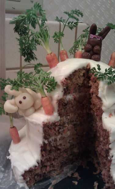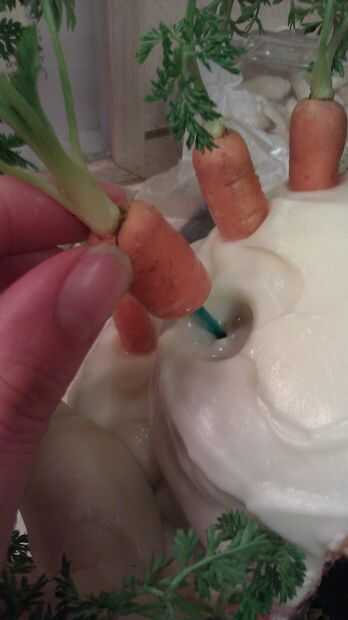 y ahora ya está listo para decorar la torta! Después de preparar las zanahorias, cortarlas por la mitad o en cualquier altura quisieran tener. Inserte un palillo de dientes en la zanahoria, luego coloque en el pastel. Los palillos son necesarios para sujetar de manera segura en su lugar. Colocar las zanahorias y conejos como usted desea. También puede añadir más detalle a la configuración como dejar las zanahorias callejeros alrededor de que el conejito ha desenterrado. Y ahí está, un pastel de zanahoria con carácter!