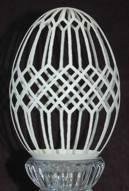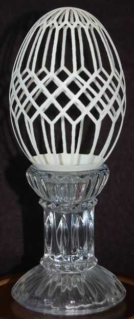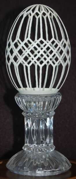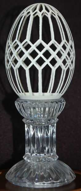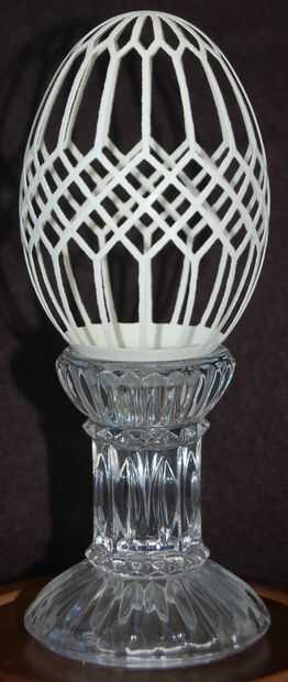 este diseño elaborado bastante complejo características un sostenedor de vela de base con 3" redondo de corian que se sienta encima del sostenedor de vela. Sobre el corian es una UEM huevo con cada extremo cortado. Uno es expoxied al corian, el otro