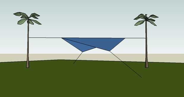 El concepto de este diseño de lona es que una cuerda de la ayuda ajustada bajo la lona entre las esquinas opuestas. La lona debe ser atado a la cuerda de soporte del centro, pero no debe ser tirar en la lona cuando la cuerda de la ayuda de centro se tiró firmemente. Esto se hace amarrando un 1 pie bucles en la cuerda donde estarán las esquinas de la lona. Los lazos son vinculados a través de los ojales de la esquina y ajustar tensión. La cuerda de la ayuda de centro debe vincularse firmemente a 10-12 pies sobre el suelo para darle un montón de espacio para la cabeza. Las otras esquinas dos cuelgan pueden atadas con cuerdas y hacia afuera. Las cuerdas de la esquina deben ser inferiores a la cuerda del centro y atan con poca tensión.