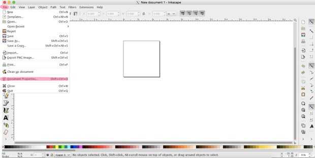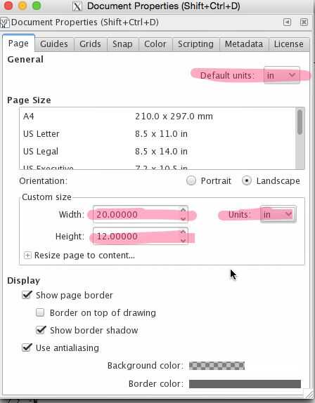 Permite tunear Inkscape sea un poco más fácil de usar. Abrir la configuración del documento (archivo > Propiedades del documento, o Cntrl + Shift + D) y definir las unidades por defecto y el tamaño de nuestra página 12 "x 20". Este es el tamaño máximo de los cortador del laser.