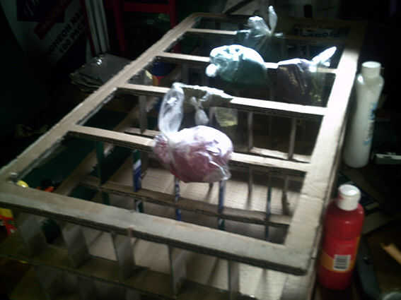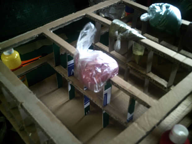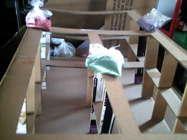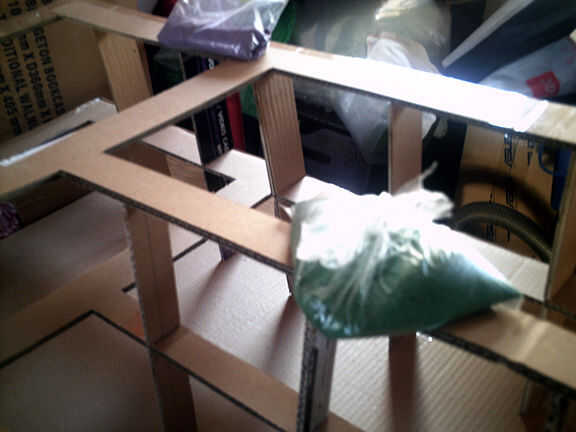 Advertencia, debe ser muy preciso en la medición y montaje en el escenario o estructura puede colapsar porque los bordes no cumplen exactamente. La otra causa principal de collaspe es si la capa es menos de 2 o 3 capas o la dirección de las rayas en el cartón los laterales son horizontales en vez de vertical.