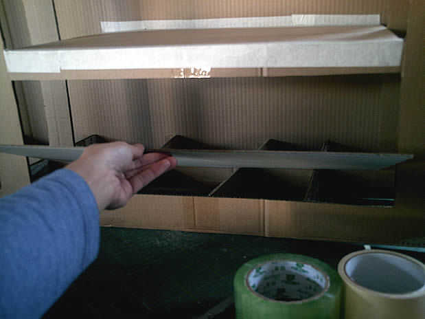 1. Mida la profundidad de cada espacio. Cortado con precisión con 1 capa de cartón de la forma del techo y la parte inferior para insertar en los lados de arriba y abajo del espacio interior. 1-2 capas de espesor son suficiente para dentro. La fuerza radica en el marco de la silueta de 3 capas y esqueleto interno.