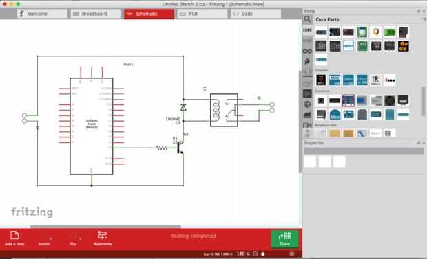 Podrás ver un esquema con todos sus componentes y sus conexiones. Poner en orden cosas arrastrando los componentes en un orden razonable y haciendo clic y arrastrando las líneas de conexión discontinua por lo que es no que se corte.