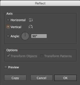 - Con todo todavía seleccionado, haga clic en objeto-->transformar-->Reflect... Bajo el eje, asegúrese de seleccionar Vertical y haga clic en OK: