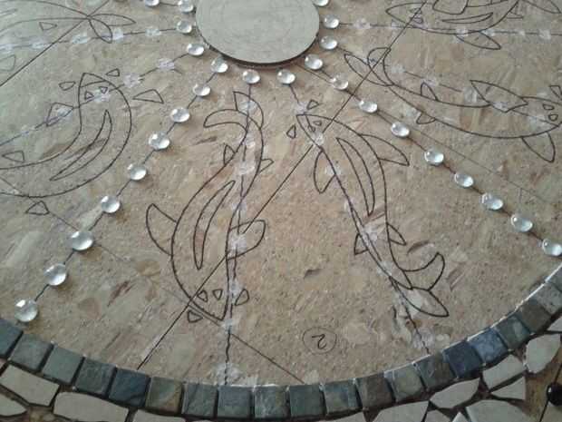 este proyecto, mi primer intento en un mosaico de azulejos y una forma de utilizar algunos azulejos sobrantes a la izquierda después de labrar el suelo del sótano. El mosaico se ve complicado, pero no es. He instalado en el vestíbulo de nuestro bunga