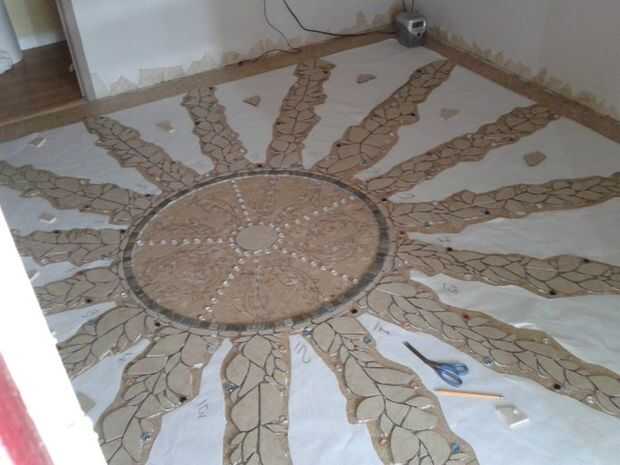este proyecto, mi primer intento en un mosaico de azulejos y una forma de utilizar algunos azulejos sobrantes a la izquierda después de labrar el suelo del sótano. El mosaico se ve complicado, pero no es. He instalado en el vestíbulo de nuestro bunga