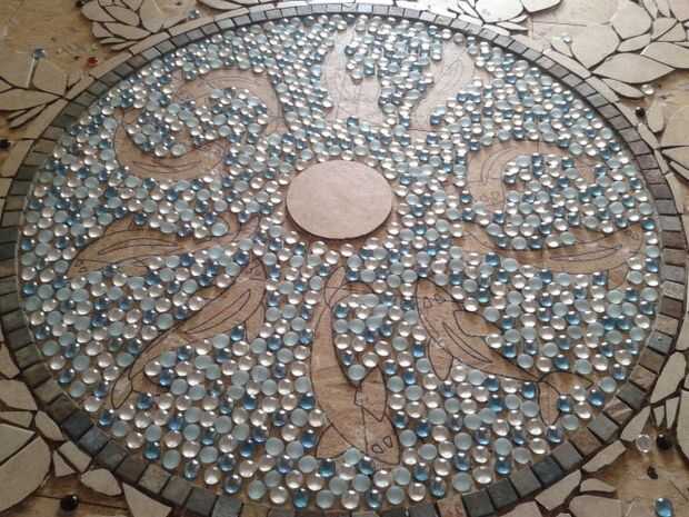 este proyecto, mi primer intento en un mosaico de azulejos y una forma de utilizar algunos azulejos sobrantes a la izquierda después de labrar el suelo del sótano. El mosaico se ve complicado, pero no es. He instalado en el vestíbulo de nuestro bunga