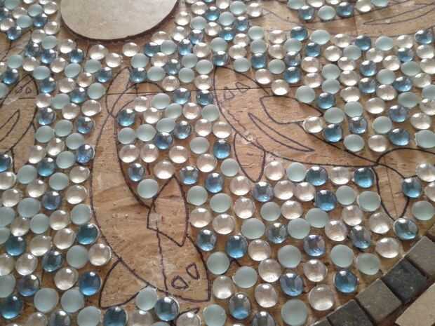 este proyecto, mi primer intento en un mosaico de azulejos y una forma de utilizar algunos azulejos sobrantes a la izquierda después de labrar el suelo del sótano. El mosaico se ve complicado, pero no es. He instalado en el vestíbulo de nuestro bunga