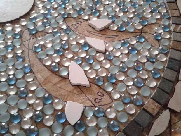 este proyecto, mi primer intento en un mosaico de azulejos y una forma de utilizar algunos azulejos sobrantes a la izquierda después de labrar el suelo del sótano. El mosaico se ve complicado, pero no es. He instalado en el vestíbulo de nuestro bunga
