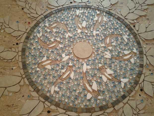este proyecto, mi primer intento en un mosaico de azulejos y una forma de utilizar algunos azulejos sobrantes a la izquierda después de labrar el suelo del sótano. El mosaico se ve complicado, pero no es. He instalado en el vestíbulo de nuestro bunga