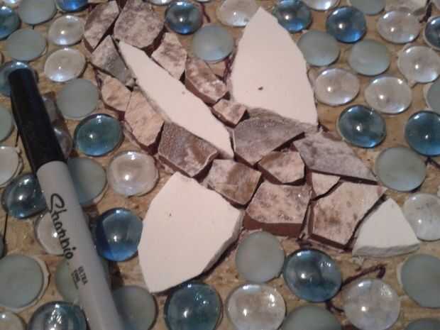 este proyecto, mi primer intento en un mosaico de azulejos y una forma de utilizar algunos azulejos sobrantes a la izquierda después de labrar el suelo del sótano. El mosaico se ve complicado, pero no es. He instalado en el vestíbulo de nuestro bunga