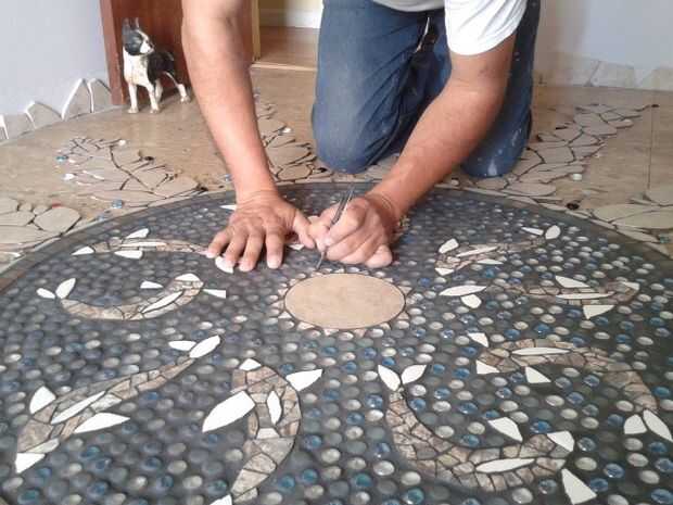 este proyecto, mi primer intento en un mosaico de azulejos y una forma de utilizar algunos azulejos sobrantes a la izquierda después de labrar el suelo del sótano. El mosaico se ve complicado, pero no es. He instalado en el vestíbulo de nuestro bunga