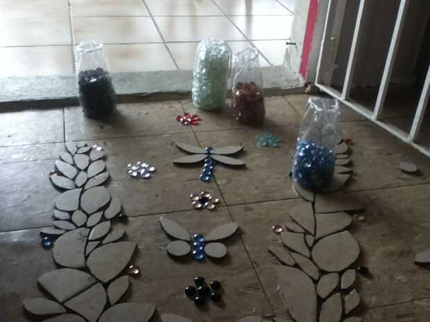 este proyecto, mi primer intento en un mosaico de azulejos y una forma de utilizar algunos azulejos sobrantes a la izquierda después de labrar el suelo del sótano. El mosaico se ve complicado, pero no es. He instalado en el vestíbulo de nuestro bunga