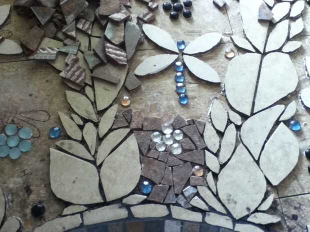 este proyecto, mi primer intento en un mosaico de azulejos y una forma de utilizar algunos azulejos sobrantes a la izquierda después de labrar el suelo del sótano. El mosaico se ve complicado, pero no es. He instalado en el vestíbulo de nuestro bunga