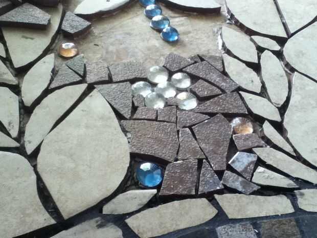 este proyecto, mi primer intento en un mosaico de azulejos y una forma de utilizar algunos azulejos sobrantes a la izquierda después de labrar el suelo del sótano. El mosaico se ve complicado, pero no es. He instalado en el vestíbulo de nuestro bunga