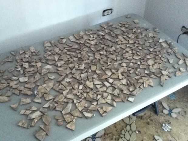 este proyecto, mi primer intento en un mosaico de azulejos y una forma de utilizar algunos azulejos sobrantes a la izquierda después de labrar el suelo del sótano. El mosaico se ve complicado, pero no es. He instalado en el vestíbulo de nuestro bunga