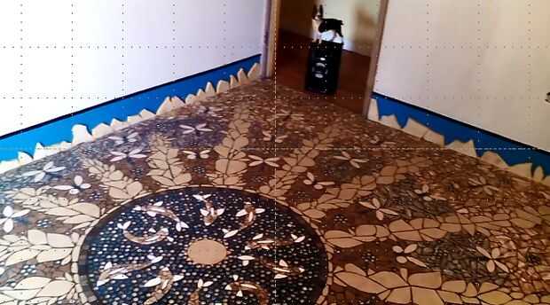 Después de semanas de duro trabajan el piso mosaico completo acabado con una banda del color complementario por encima de los azulejos fracturados. Representan los océanos del mundo.