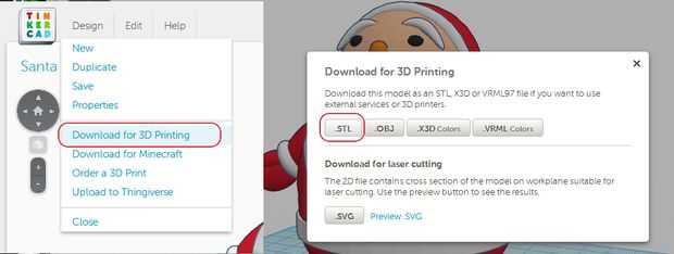 Cuando termine el modelado, se puede descargar STL directamente en la lista del menú: diseño -> descargar para impresión 3D. Continuación, seleccione formato de archivo STL para la impresión, descargará en el disco local.