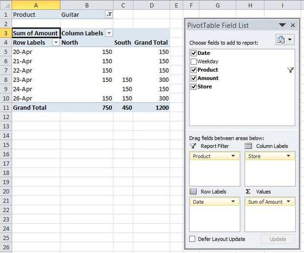 El informe de tabla dinámica construida en este paso muestra las ventas en cada fecha de la semana del 20 de abril para el norte y sur almacena individualmente. Incluye un filtro de informe para que el usuario puede ver las ventas para cada tipo de producto.