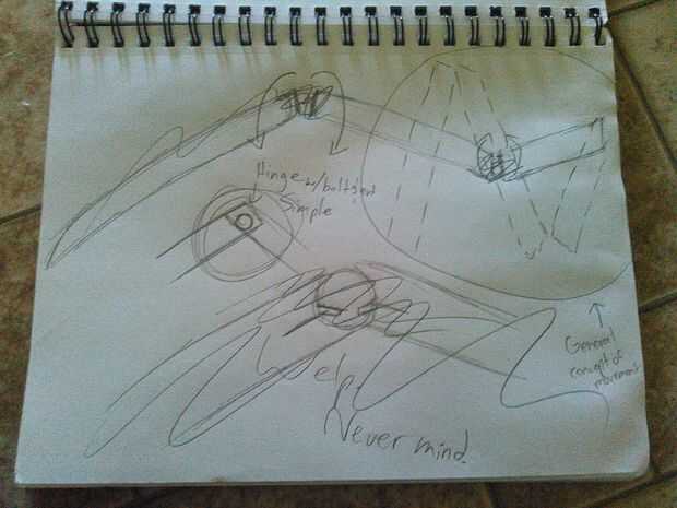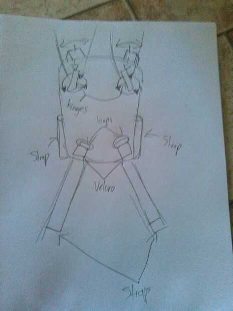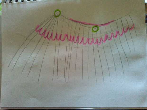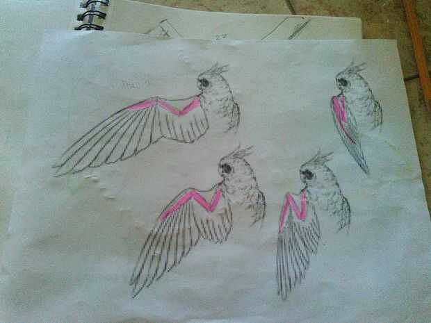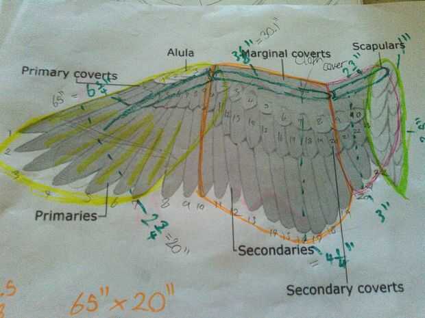 me di cuenta hace poco que había dejado un montón de diseño de arnés, así que comencé a dibujar como un loco. He contado el número de plumas necesitaba y elaborado cada detalle mecánico. Acabé decidiendo que iba a tener las alas giran un poco a la base. También voy a poner una forma de tapón de modo que las alas no... caen. También planeo unir cada pluma primaria con una sección de pequeño pasador para el soporte y sujetar con cuerdas como se muestra en la imagen final de este paso.