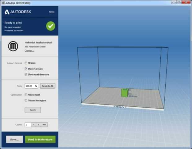 Después de configurar las opciones de impresora, se le dará la opción para guardar como un fichero .stl o enviar directamente al software Makerware para la impresión.