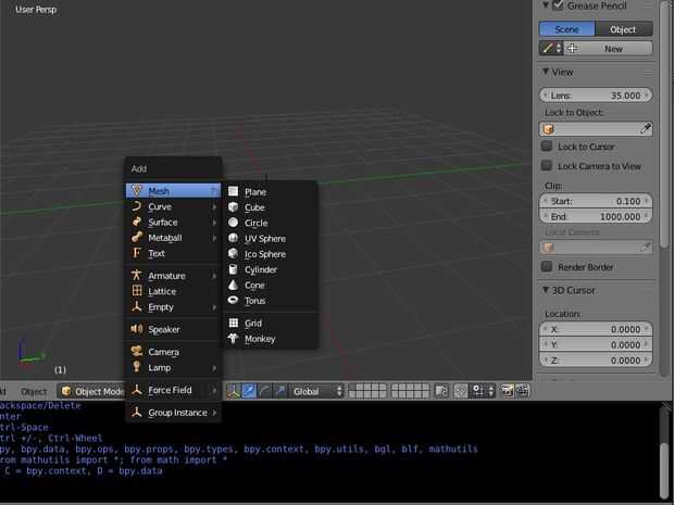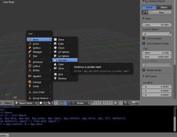 Ahora debe crear un cilindro. Tipo ' Shift +' para añadir un objeto, y se abrirá una lista. sienten libres para desplazarse por los tipos de objetos, pero la que queremos es bajo 'Malla'
