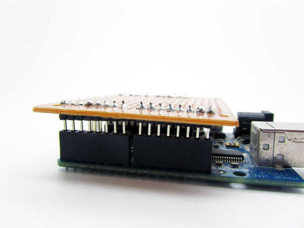 Primero tienes que poner la cabecera de pernos lejos de rotura en su arduino y luego poner la placa de prototipo en la parte superior. Conseguir la posición correcta, asegúrese de que todos los pasadores estén perfectamente conectados.