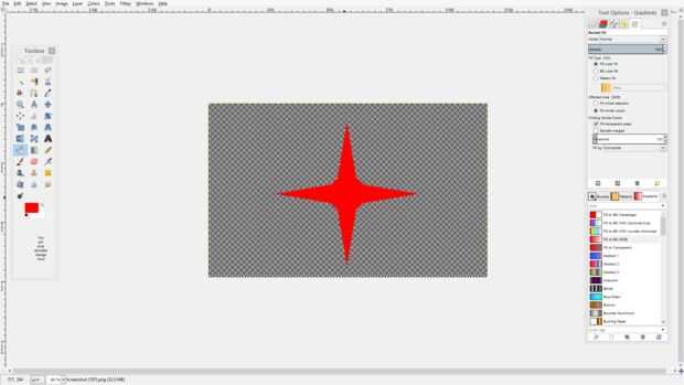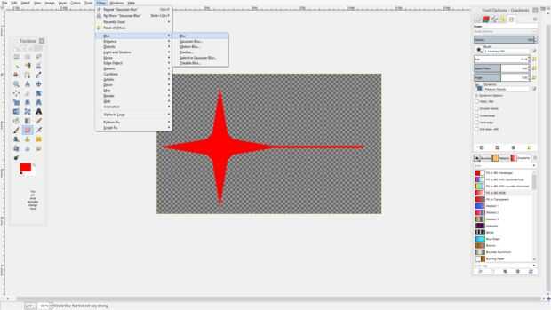 Invertir la selección para que todo, pero la estrella es seleccionado y eliminarlo para dejar sólo la estrella y el patrón de cuadros de la transparencia. Luego llené la estrella con rojo con la herramienta de relleno, después de seleccionar por color otra vez y dibujo una línea recta a la derecha. Yo entonces le dio un ligero desenfoque de la pestaña "Filtros" (como se ve en la imagen de arriba) y borrosa manualmente los bordes con la herramienta de desenfoque, encontrado en la caja de herramientas.