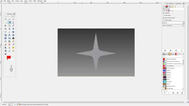 Comencé mi logo por cultivo una captura de pantalla de mi "estrella" y seleccionando el color de la estrella con un umbral bajo "Seleccionar por color Tool", en la ventana de la izquierda, la caja de herramientas (la configuración de las herramientas puede encontrarse en la ficha de final de la ventana derecha).