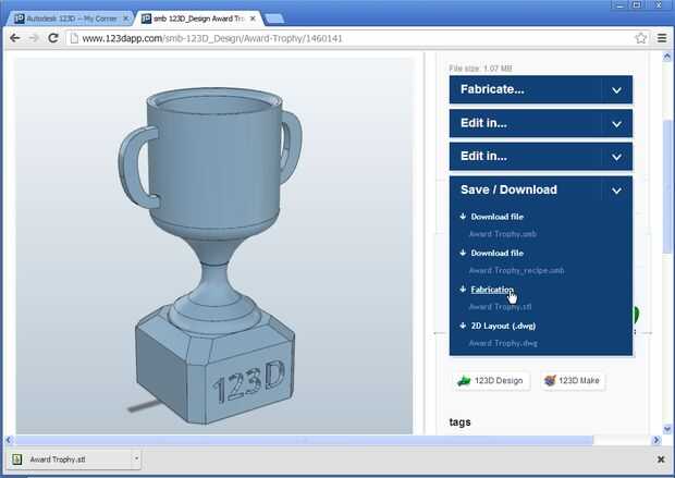 Consejos: Si no ves un archivo STL de opción bajo 'Fabricación', que significa que archivo de impresión 3D aún no está listo. Simplemente espera un momento y luego volver a cargar la página en su navegador.